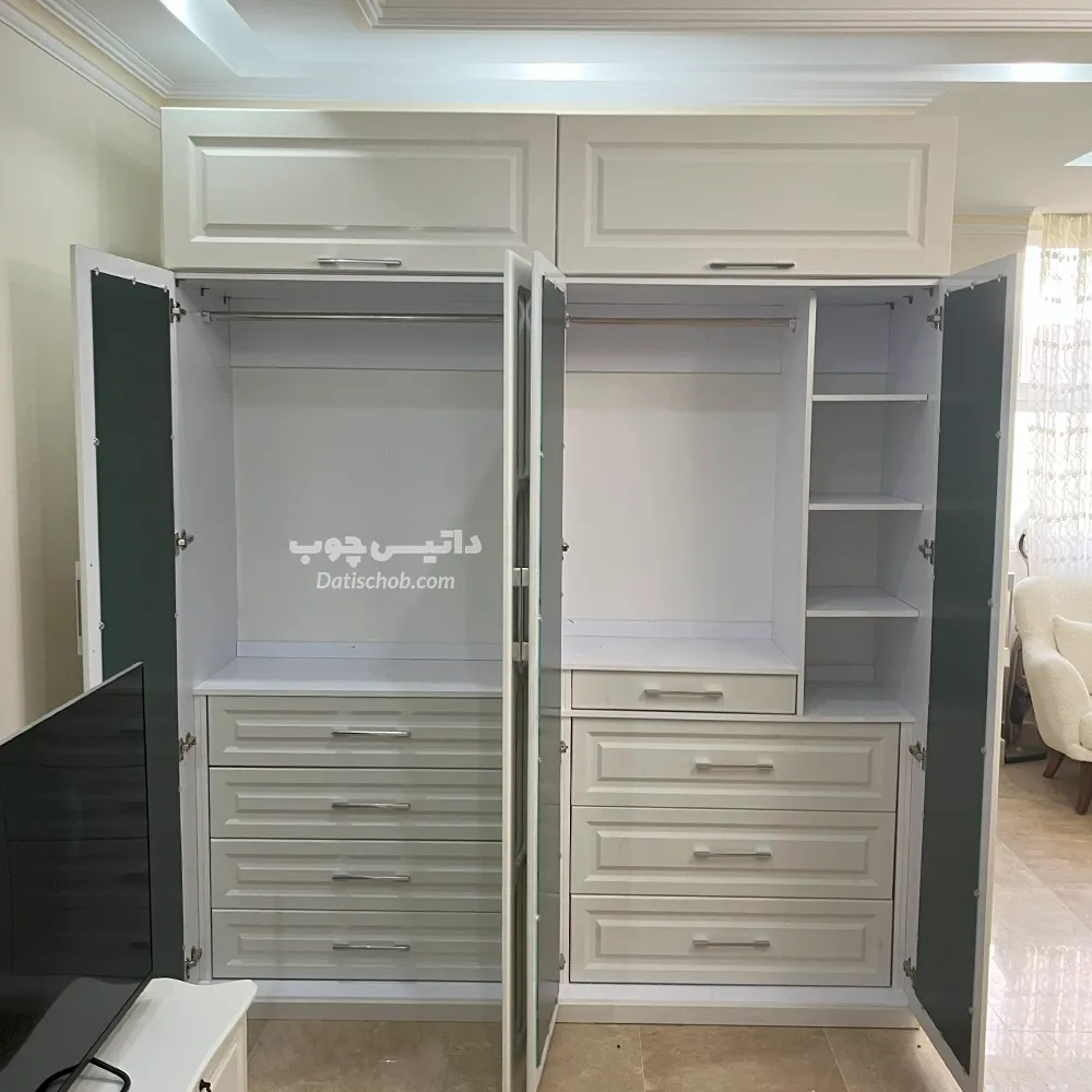 کمد لباس مدرن سفید طرح پنجره ای مدل P85 سفارشی است و میتواند با اندازه اتاق، جنس و رنگ دلخواه شما تولید شود. برای ساخت این کمد با درب لولایی، از ورقهای چوبی شرکتی استفاده شده است که جنس بسیار باکیفیت و دوام بالا دارند. تمامی لبههای این کمد لباس مدرن، با استفاده از نوارهای محکم پی وی سی تقویت شدهاند، که در برابر نفوذ آب، بسیار مقاوم عمل میکنند. کمد لباس مدرن سفید طرح پنجره ای مدل P85 دارای چهار طبقه و یک رگال و 4 کشو در سمت راست، همچنین 4 کشو و یک رگال لباس در سمت چپ میباشد. دقت داشته باشید که میتواند با اندازه مورد نظر شما تولید شود. این محصول آینه ندارد اما درصورت نیاز میتواند اضافه شود.